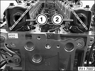 With cylinder No. 1 in ignition TDC position, cams of exhaust camshaft (2) and intake camshaft (1) at 6th cylinder point downwards at an angle.