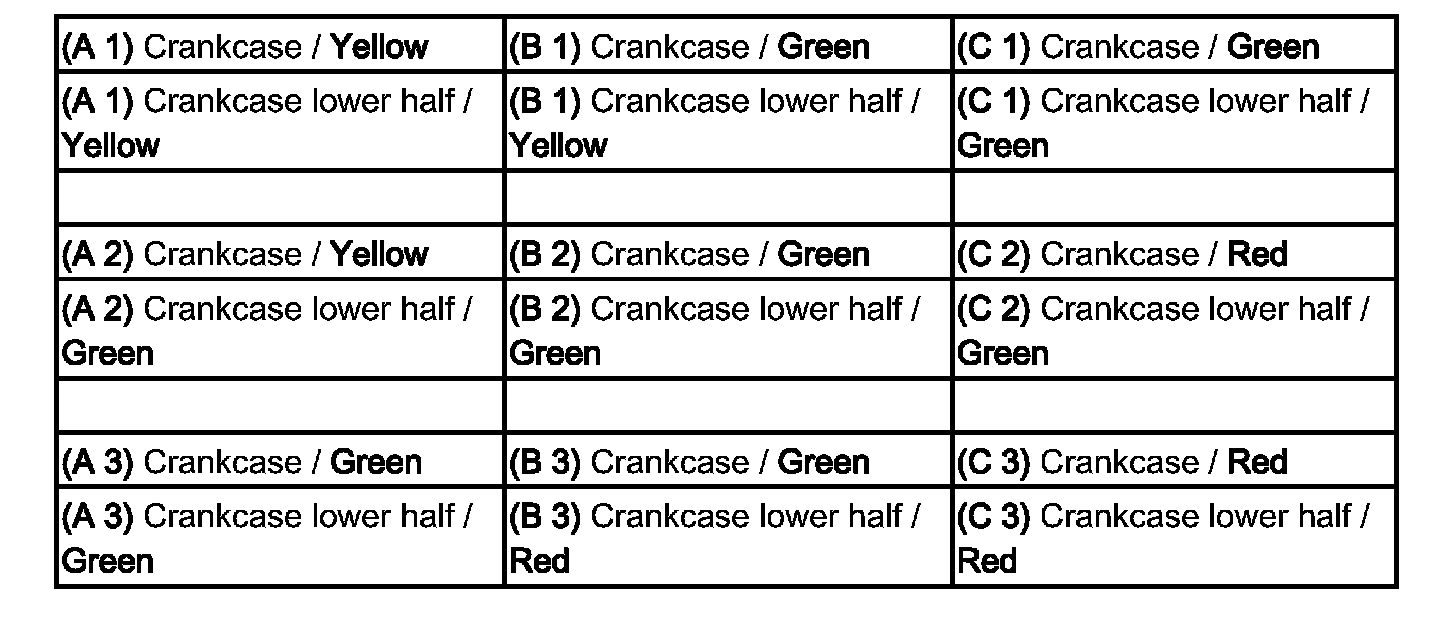 Possible color combinations for mounting the crankshaft in the crankcase.