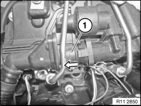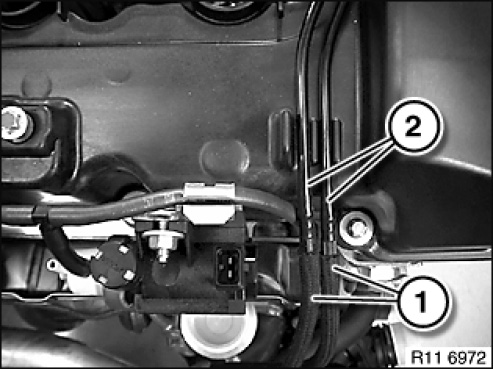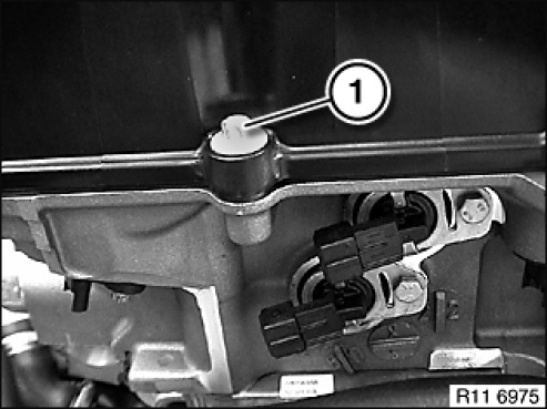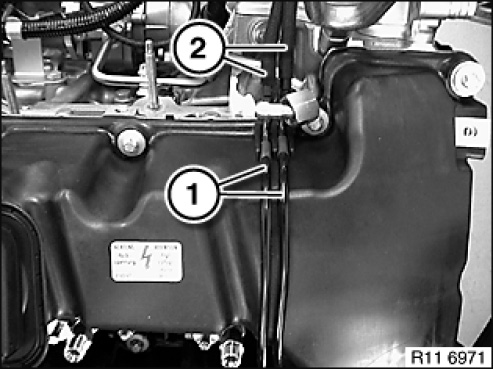 Detach engine ventilation (1) at cylinder head cover and remove in direction of arrow.