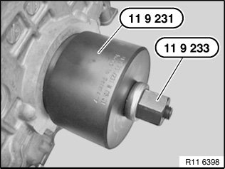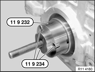Draw in crankshaft seal with special tool 11 9 231 in conjunction with special tool 11 9 233 until flush.