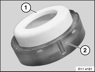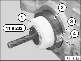 Support bush (1) remains on special tool 11 9 232 until crankshaft seal is drawn in.