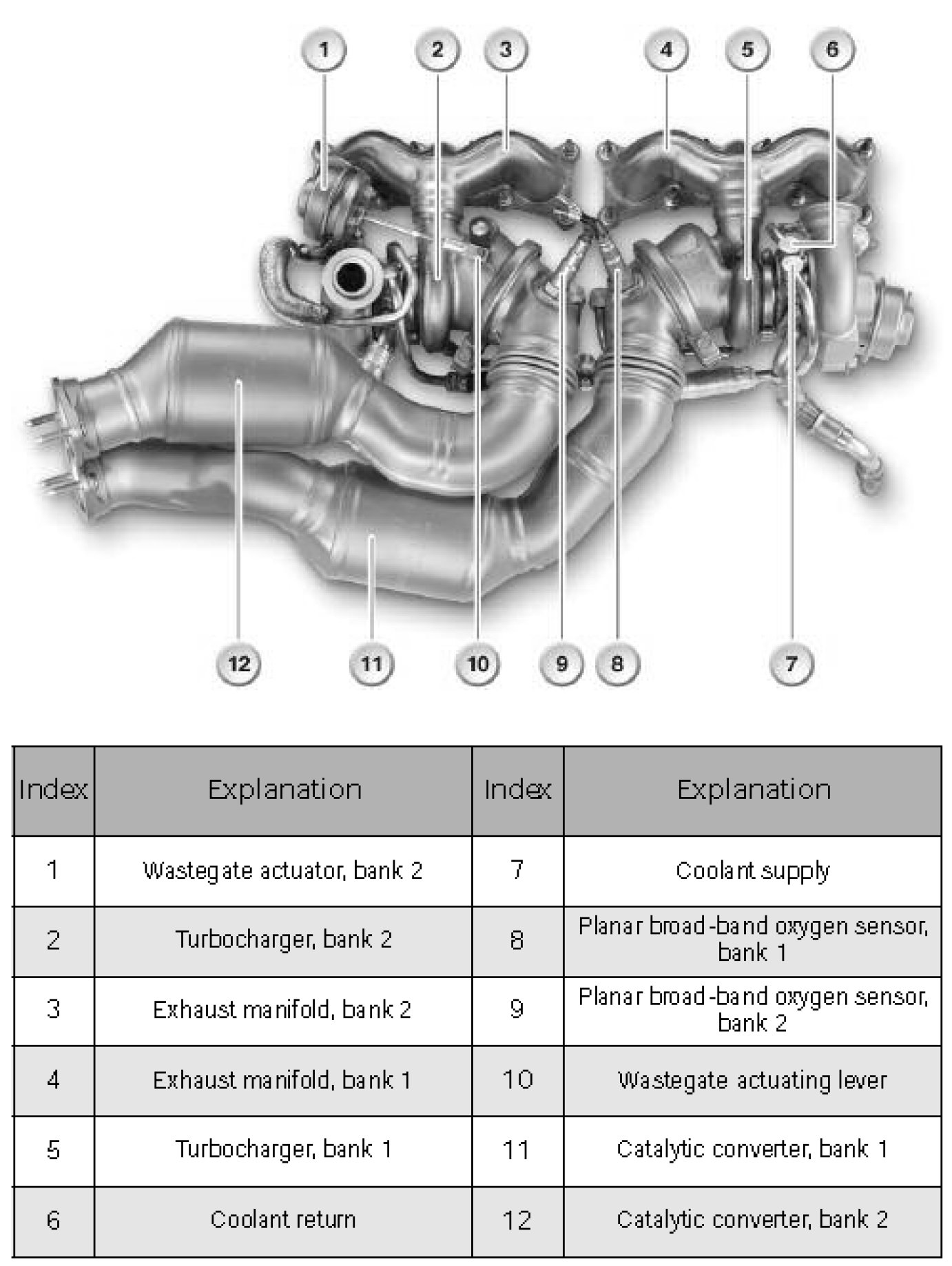 Cylinders 1, 2 and 3 (bank 1) drive the first turbocharger (5) while cylinders 4, 5 and 6 (bank 2) drive the second (2).