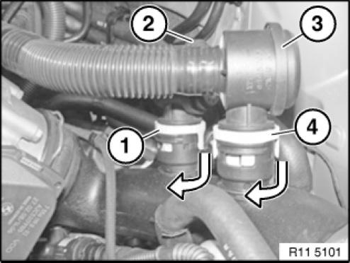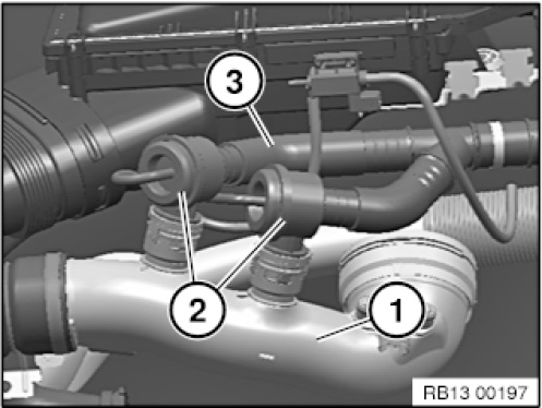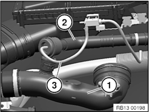 Install the blow-off pipe (2) with a blow-off valve. A vacuum line with a T-piece is no longer needed. Instead, install a new vacuum line (3) between the blow-off valve and the electric changeover valve or intake plenum.