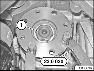 Secure drive flange with special tool 23 0 020 against turning and release nut (1).