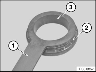 Lever shaft seal (1) with a suitable open-end spanner (2) in direction of arrow out of rear axle final drive.