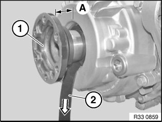 Insert drive flange (1) to dimension A=4.5 cm into rear axle final drive (gearing on drive flange not visible).