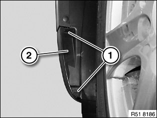 Release screw (1) at bottom of lower wheel arch cover (2).