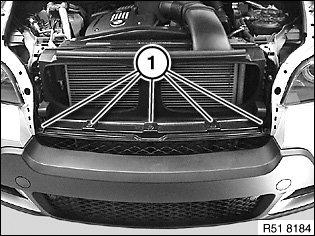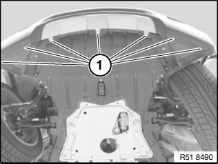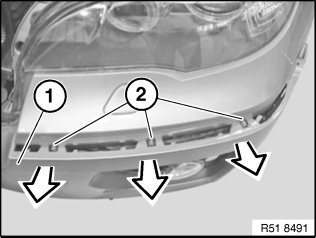 Remove bumper trim (1) towards front with aid of a 2nd person.