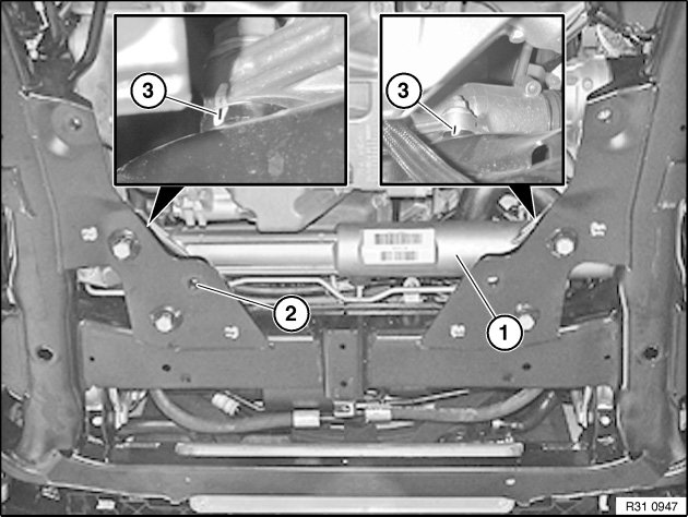 Disconnect pressure line (2) and return line (3) from power steering gear.