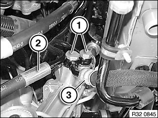 Disconnect pressure line (2) and return line (3) from power steering gear.