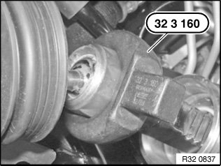 Unscrew tie rod with special tool 32 3 160 from rack of power steering gear.
