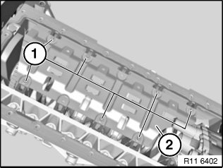 Drive both injector nozzles (1) on left and right with special tool 11 9 360 into crankcase up to stop.