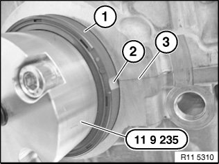Position radial shaft seal (1) with special tool 11 8 220 on the crankshaft.