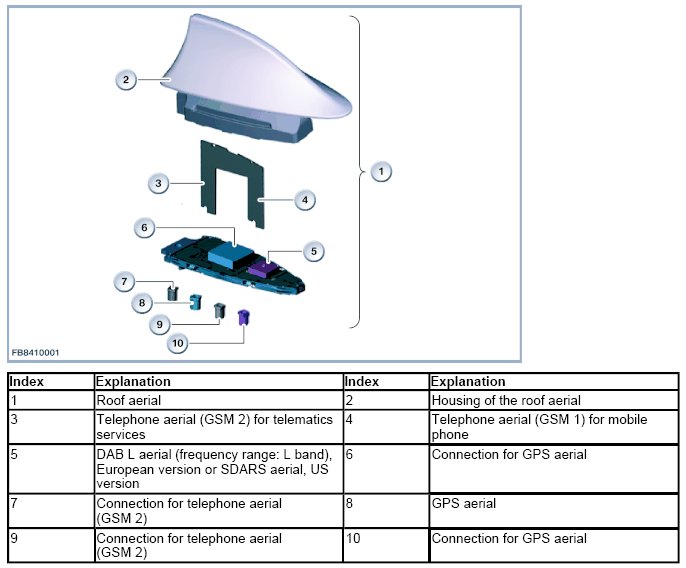 Within the scope of certain optional equipment, further additional aerials which are not for the telephone or telematics may be installed in the roof-mounted aerial (e. g. Digital Audio Broadcasting, Satellite Digital Audio Radio Service).