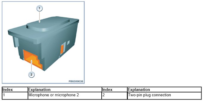 The 2 hands-free microphones (microphone and microphone 2) are installed in the outer left and right sides of the roofliner near the sun visors. The 2 microphones are used for hands-free mode during telephone operation and for voice input for the Active Voice Recognition.