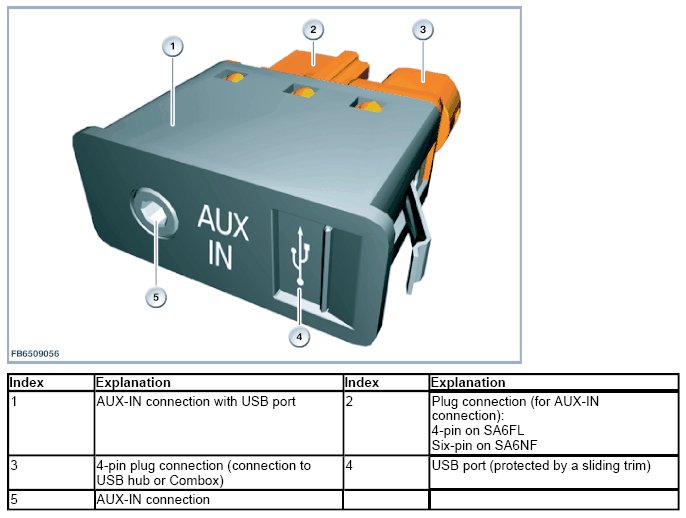 The audio socket (AUX-IN connection) can be used to connect an external audio source (e. g. MP3-or CD player) via a 3.5 mm jack plug. The unit is operated on the operating elements of the external audio source. The AUX-IN connection with USB port (SA6FL USB audio interface) is available as optional equipment. External audio sources with USB port are integrated in the vehicle's entertainment system via this USB audio interface (switched). A connection for Smartphones is offered for connection of the MP3-player in the mobile phone (SA6NF Extended connectivity of the music player in the mobile phone).