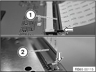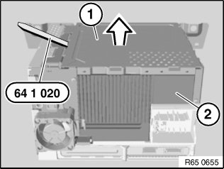 Raise lid (1) with special tool 64 1 020 all round and remove from Car Communication Computer (2).