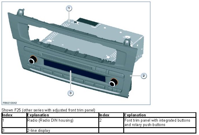 This radio is not equipped with a MOST interface. The radio has a 2-row display on its front. An external Central Information Display (CID) and a controller (CON) are not installed on this headunit. Operation is only by means of the integrated buttons and the 2 rotary push-buttons.
