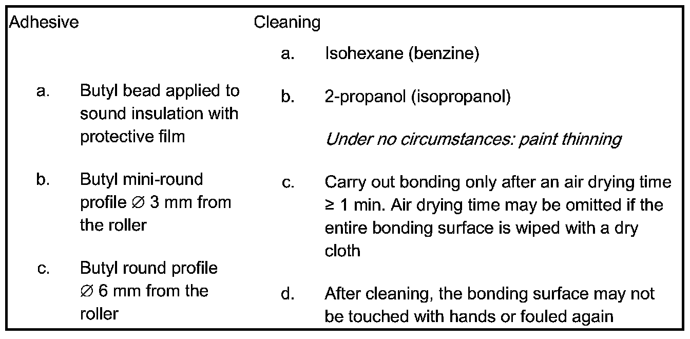 - Bonding area must not show any traces of adhesion-reducing residues (e.g. separating agents, greases, oils, paraffins, plastisols, cavity wax, polishing dust residues, etc.)