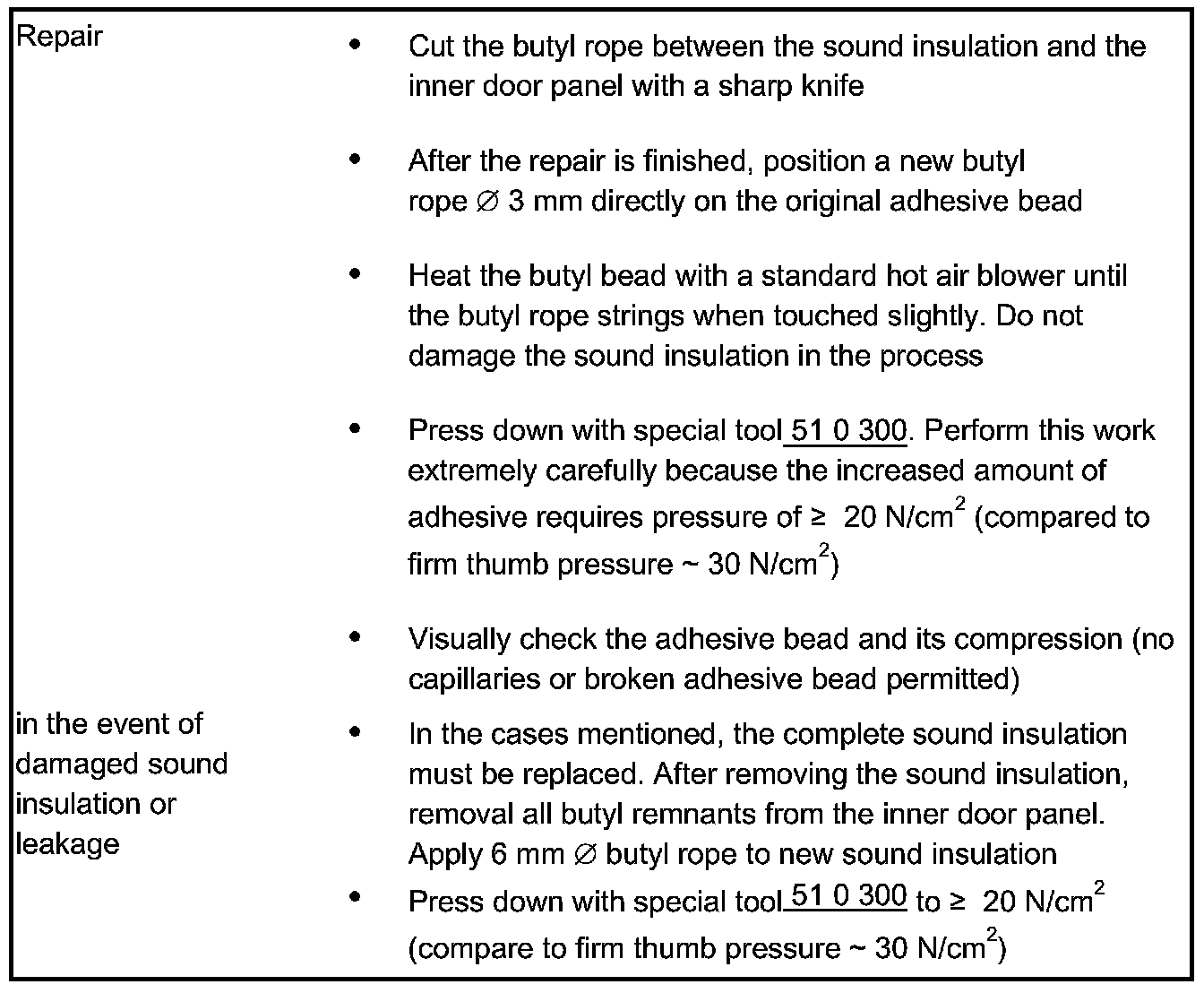 - The sound insulation must be attached with positional accuracy to the inner door panel, because it is no longer possible to change the position without damaging the butyl bead