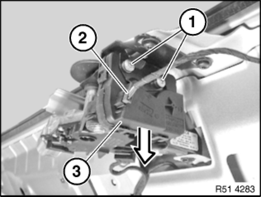 Disconnect plug connection (2) and remove rear window lock (3) towards bottom.