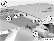 Raise floating headlining (4) and remove over control rail (3) in direction of arrow (2).