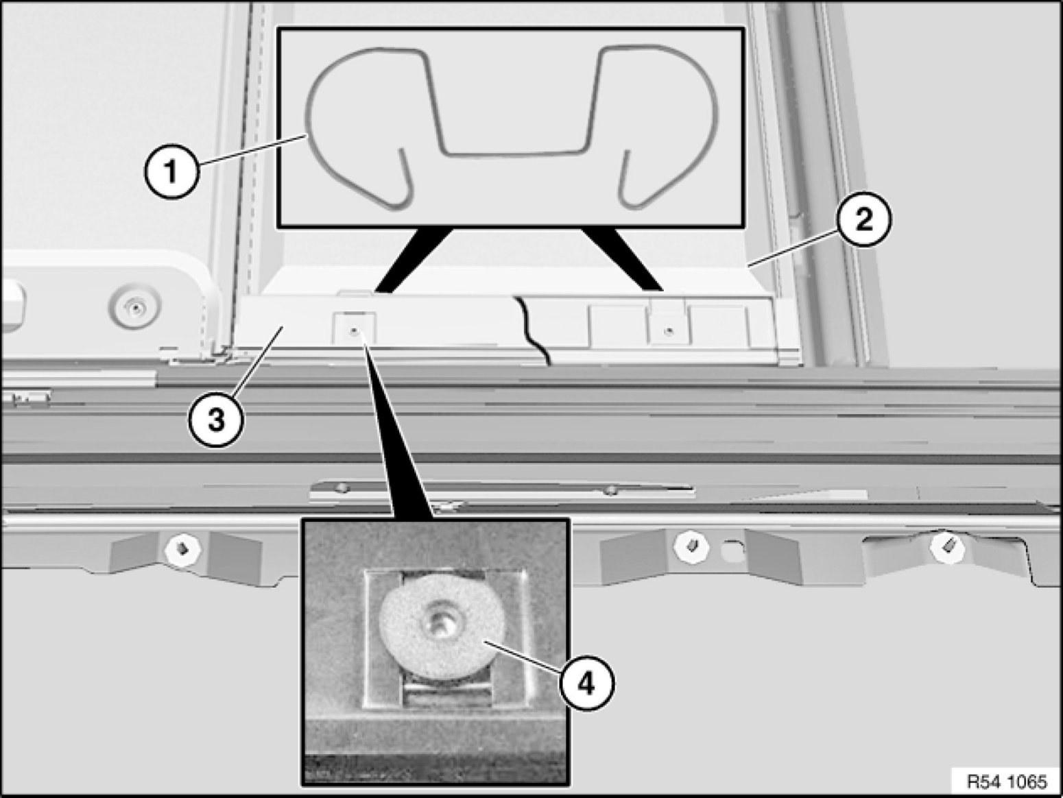Raise floating roofliner (4) and remove over control rail (3) in direction of arrow (2).
