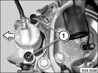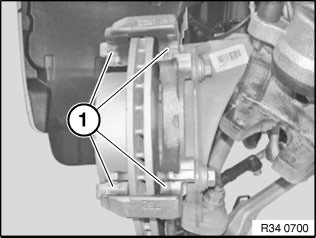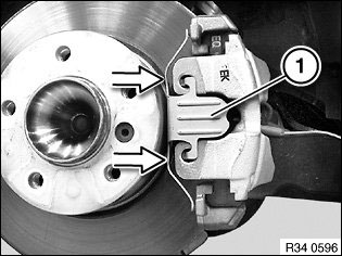 Unfasten guide screws (1) and lift out brake caliper towards rear of vehicle.
