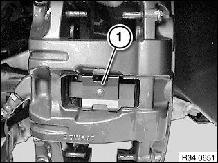 Release bolts (1) and pull off brake caliper with brake anchor plate towards rear.