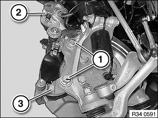 Release screws (1), remove brake calliper (2) with brake console (3) and tie back.