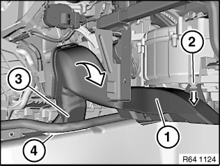 Detach right footwell heating duct (1) with adapter (3) from heater/air conditioner and remove in direction of arrow from right rear compartment heating duct (4).