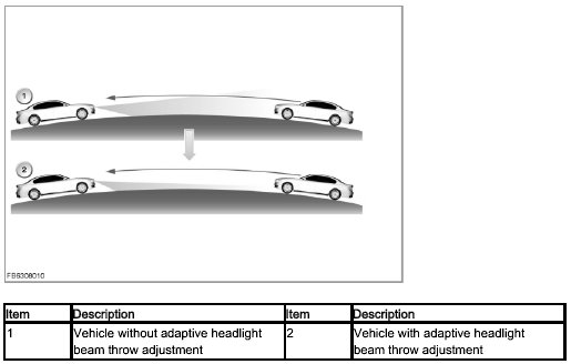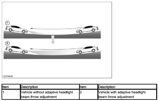 When the vehicle passes over a crest, the headlight beam throw is reduced somewhat. The swivel module is moved down slightly. This reduces dazzling effect of an oncoming vehicle.