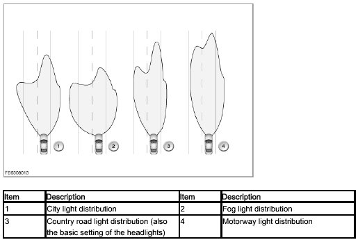 The country road light distribution is the same as the standard low-beam headlights. At a driving speed above approx. 50 km/h, the city light distribution is changed to the country road light distribution. Below a driving speed of approx. 50 km/h, the footwell module (FRM) changes the light distribution back to city. The country road light distribution represents the basic setting for the headlights. The basic setting is assumed when there are faults in the complete light distribution system.