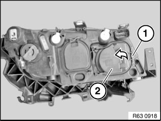 Unlock retainer (1) and remove cover (2) in direction of arrow from headlight.