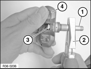 Using suitable pliers (2), unscrew valve (1) from the thread of the square-head bolt (3), while holding the wheel module (4) firm.
