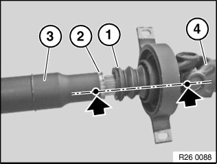 The propeller shaft is balanced. The front and rear propeller shafts must be reassembled in the same position.