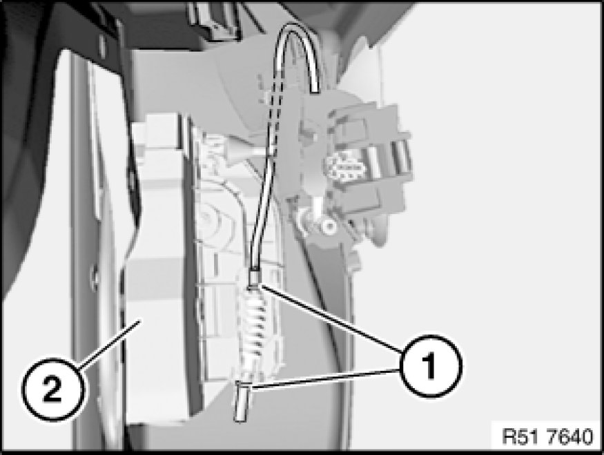 Bowden cable (1) must be correctly engaged in locators in door lock (2).