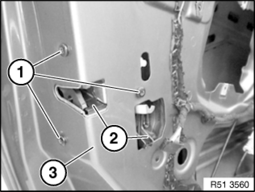 Pull door lock (2) with special tool into corner (3), see Figs. R51 3381 and R51 7594.