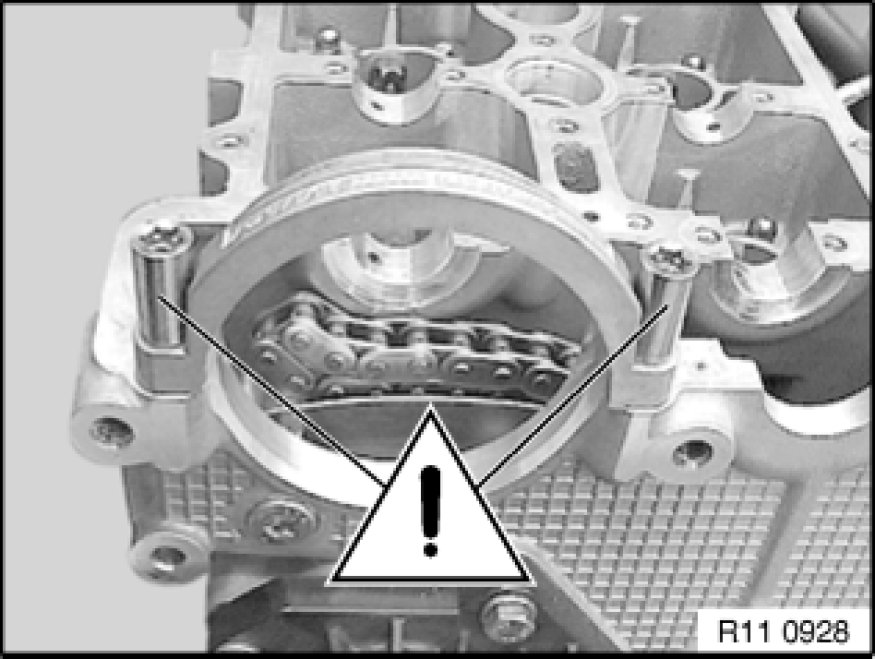 If the sprocket wheel is removed without the hydraulic chain tensioner being locked, the chain tensioner piston will slip out and can then only be pressed back again with a considerable amount of effort.