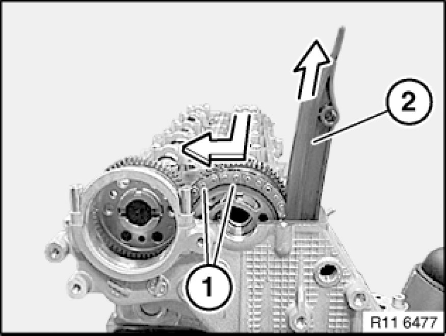 Release sprocket wheel with chain (1) from inlet camshaft in direction of arrow.