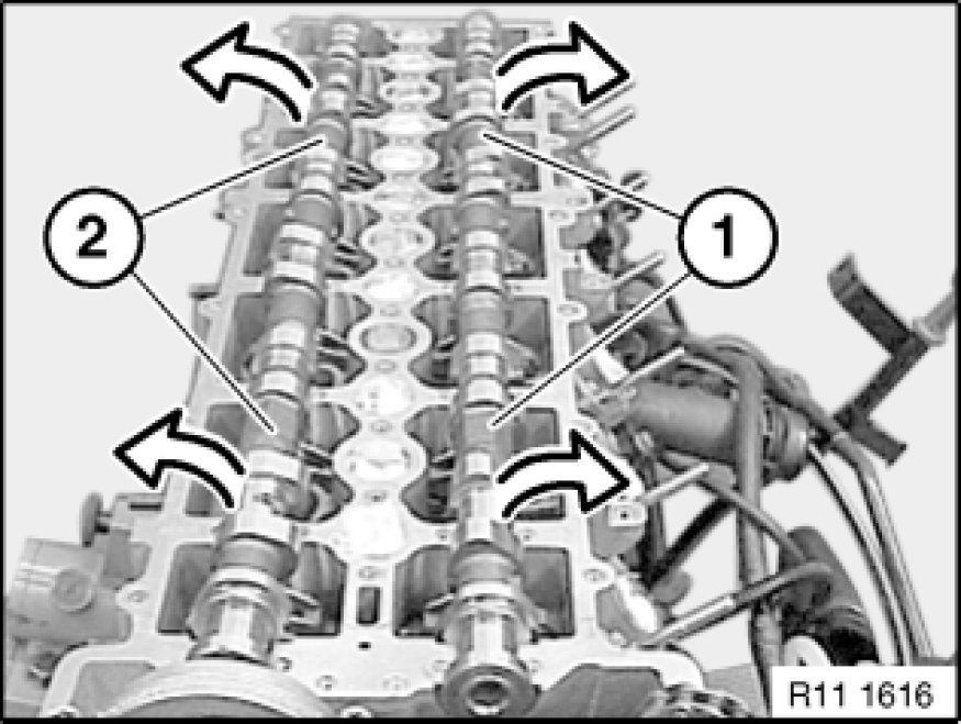 Marking (1) on inlet camshaft must be between markings (2) on exhaust camshaft.