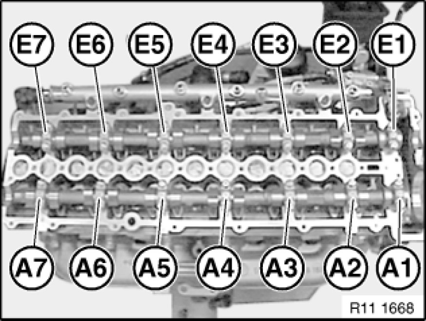 The inlet camshaft bearing covers are marked E 1 ... E 7 from the exhaust side.
