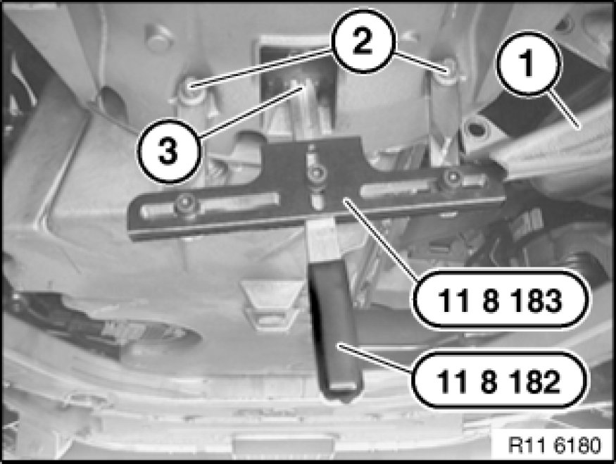 Mount special tool 11 8 183 11 8 180 Holder and 11 8 182 11 8 180 Holder on transmission screws (2).