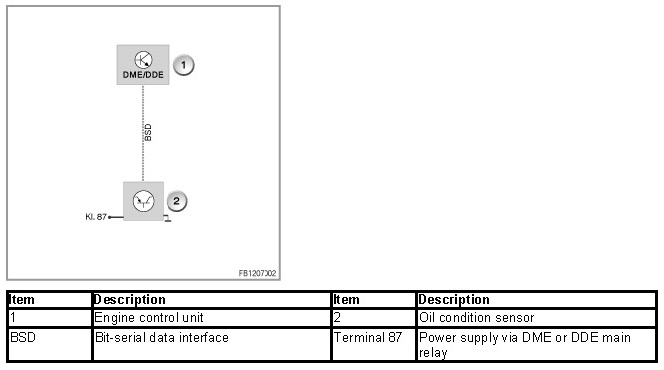 The oil condition sensor is connected via a bit-serial data interface to the engine management system. Power is supplied via terminal 87.