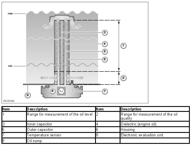 The oil level is measured for the electronic oil level check. The 2nd capacitor in the upper part of the oil condition sensor registers the oil level with the engine running. The capacitor is at the same level as the oil level in the oil sump. As the oil level changes, the capacitance of the capacitor changes. The electronic evaluation unit creates a digital signal from this. The engine management system uses this to calculate the engine oil level. The electronic oil level check is displayed on the Central Information Display (CID) as well as in the instrument cluster. On vehicles without CID, the oil level is only displayed in the instrument cluster.