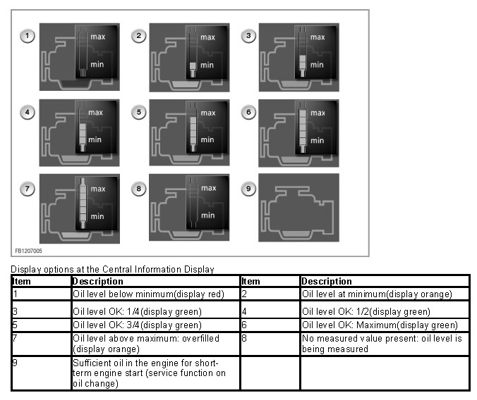 Initially, no oil level is stored. "Oil level under min" is then displayed. The correct oil level is only displayed after approx. 2 minutes of engine operation (engine at operating temperature, engine speed greater than 0, vehicle stationary).