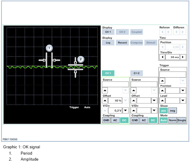 The figure below shows a rail pressure sensor signal that is in order thus indicating an intact high pressure pump. The signal pulsating uniformly at a period of approx. 25 ms and an amplitude of approx. 20 mV can be clearly seen. The maximum permissible value for the amplitude is 40 mV.