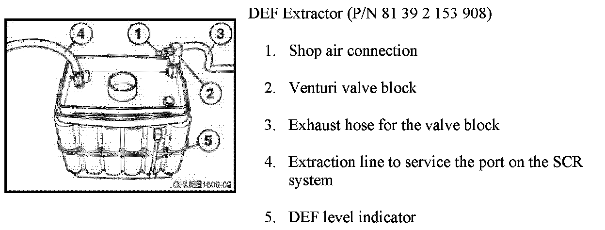 The DEF Extractor/Filler unit (refer to from 05/09) removes DEF from the system, using compressed air to create a vacuum using the Venturi principle. The extractor can hold 11 liters of DEF fluid.