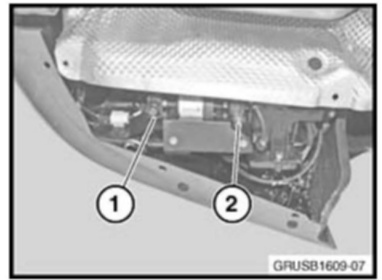 2. Service ports for the active (1) or the passive reservoirs (2) are located under the right side of the vehicle.