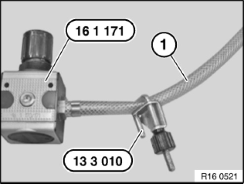 Using compressed air line (1), connect special tool 16 1 171 to workshop compressed air system (8 ... 10 bar).